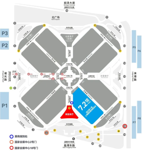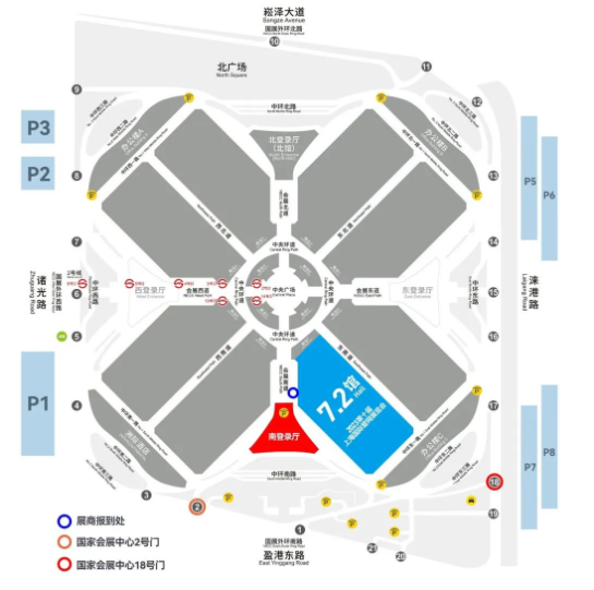 上海虹橋機場:乘坐地鐵2號線至徐涇東站9號口出,步行至國家會展中心(上海)南廣場2號門-步行至南廣場8米層登錄大廳;