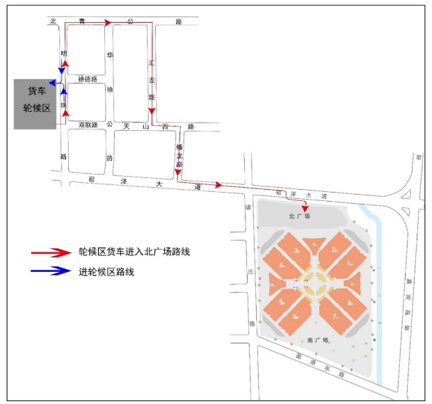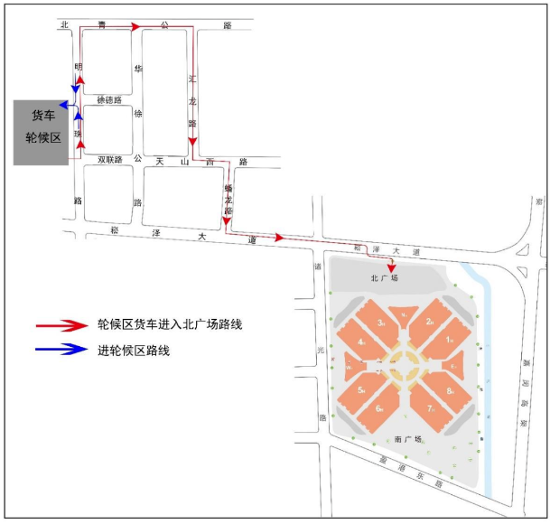 貨車路線(布展期間):車輛于明珠路和雙聯路路口P24停車場輪候并領取輪候證件-由國家會展中心(上海)10號門進入北廣場-憑展商證件于北廣場制證中心辦理車證-7.2號館