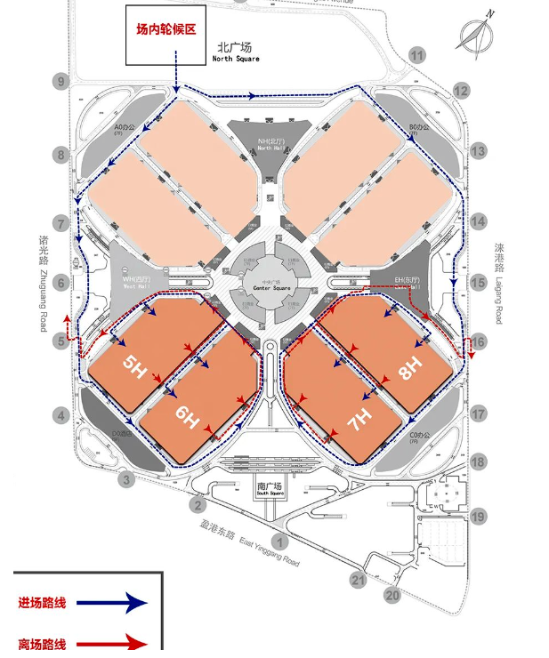 按如圖所示前往7.2號展館裝卸,并于16號門進入外環后離場。